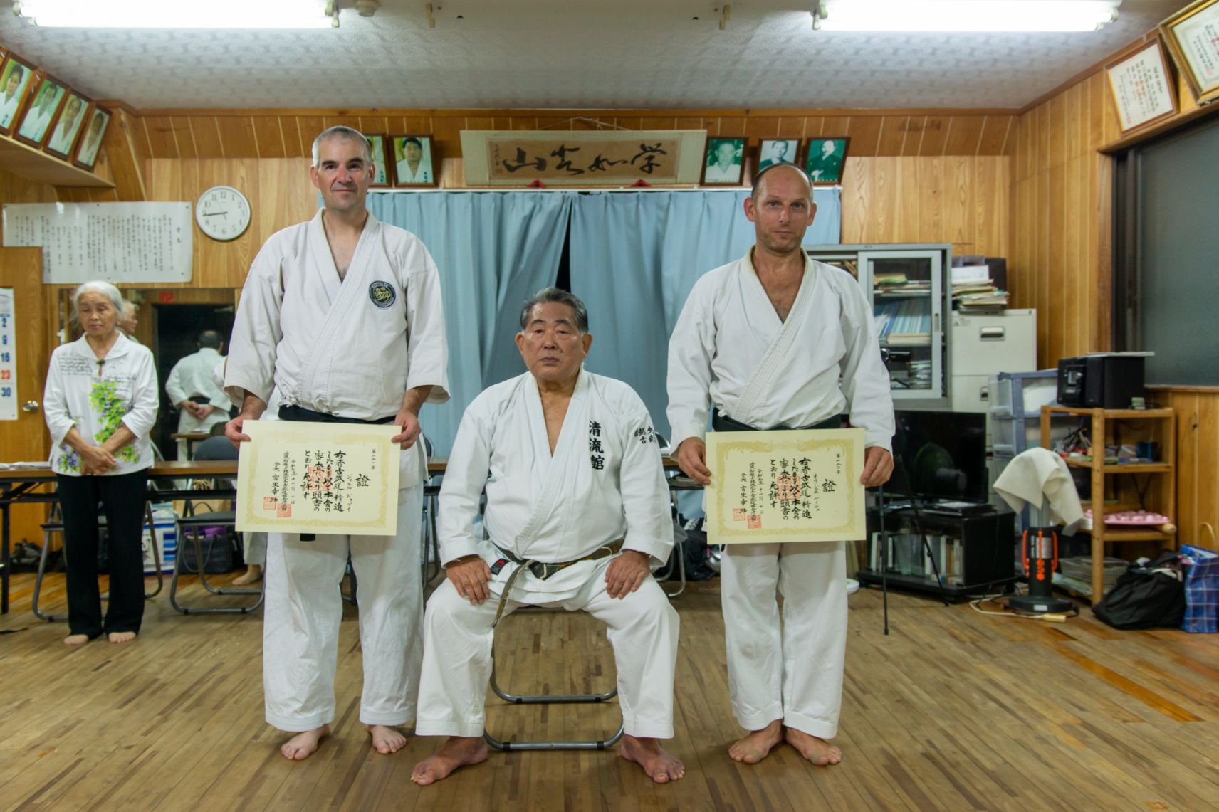 Nous nous entraînons au hombu dojo, le dojo principal, avec ses élèves les plus gradés. Nous sommes les seuls élèves étrangers à y être reçus régulièrement. Nous sommes aussi invités par l’une de ses élèves, Hisami Horikawa sensei, 8ème dan, pour des entraînements dans la salle municipale de Shuri où elle donne des cours.